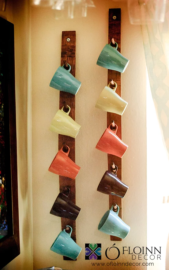Add a feeling of warmth and comfort to your kitchen, breakfast nook, or drink station with this hand-crafted coffee mug rack made from wonderfully-aged oak wine barrel staves. The solid construction holds up to 5 heavy coffee mugs or cups. Price is for 1 rack.