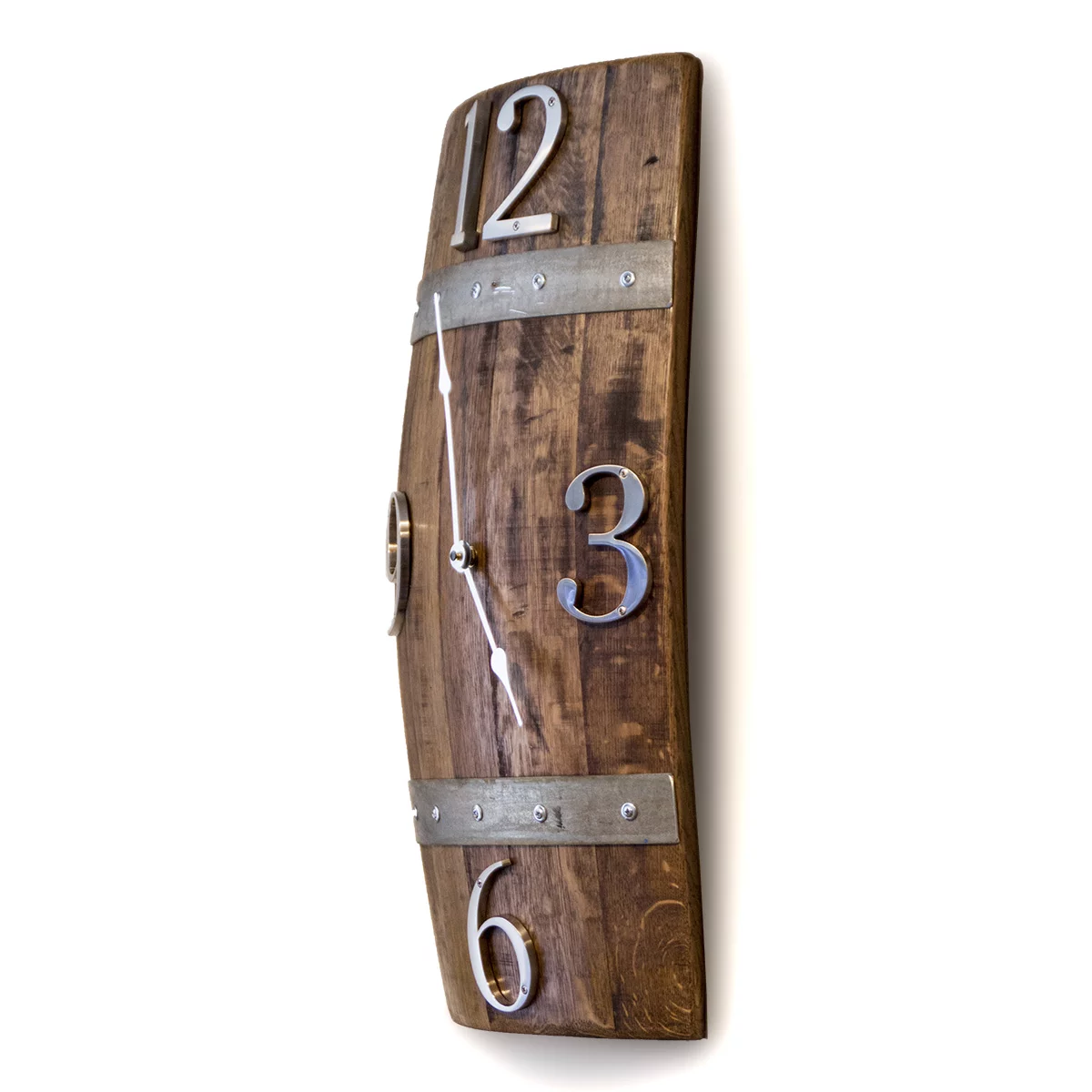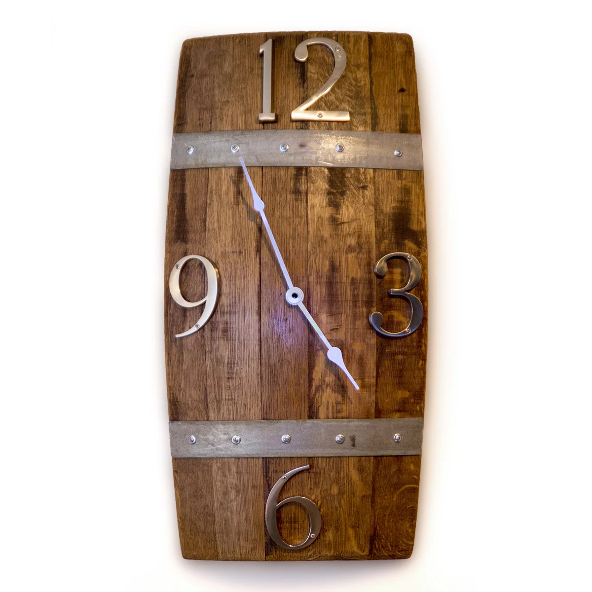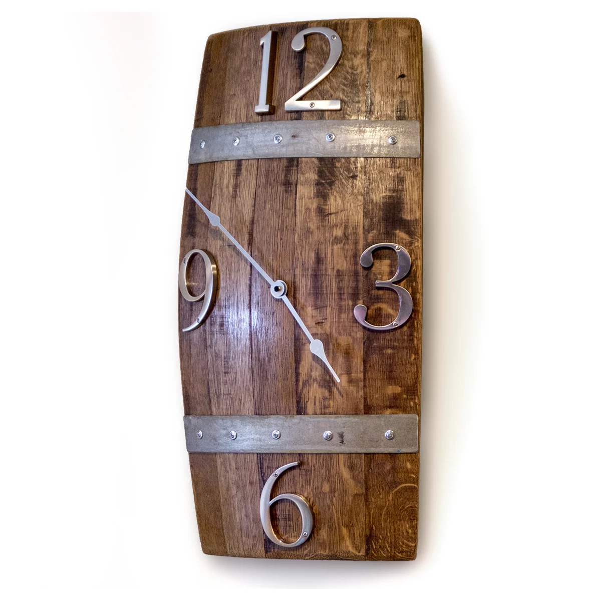 This Wine Barrel Stave Wall Clock. Made from retired wine barrel staves this clock is an impressive 25″ tall, 13″ wide and extends 4-5″ from the wall. It mounts using a standard wire. The large brushed metal numbers add a wonderful level of classiness to this rustic piece. The metal bands are made from retired barrel hoops.