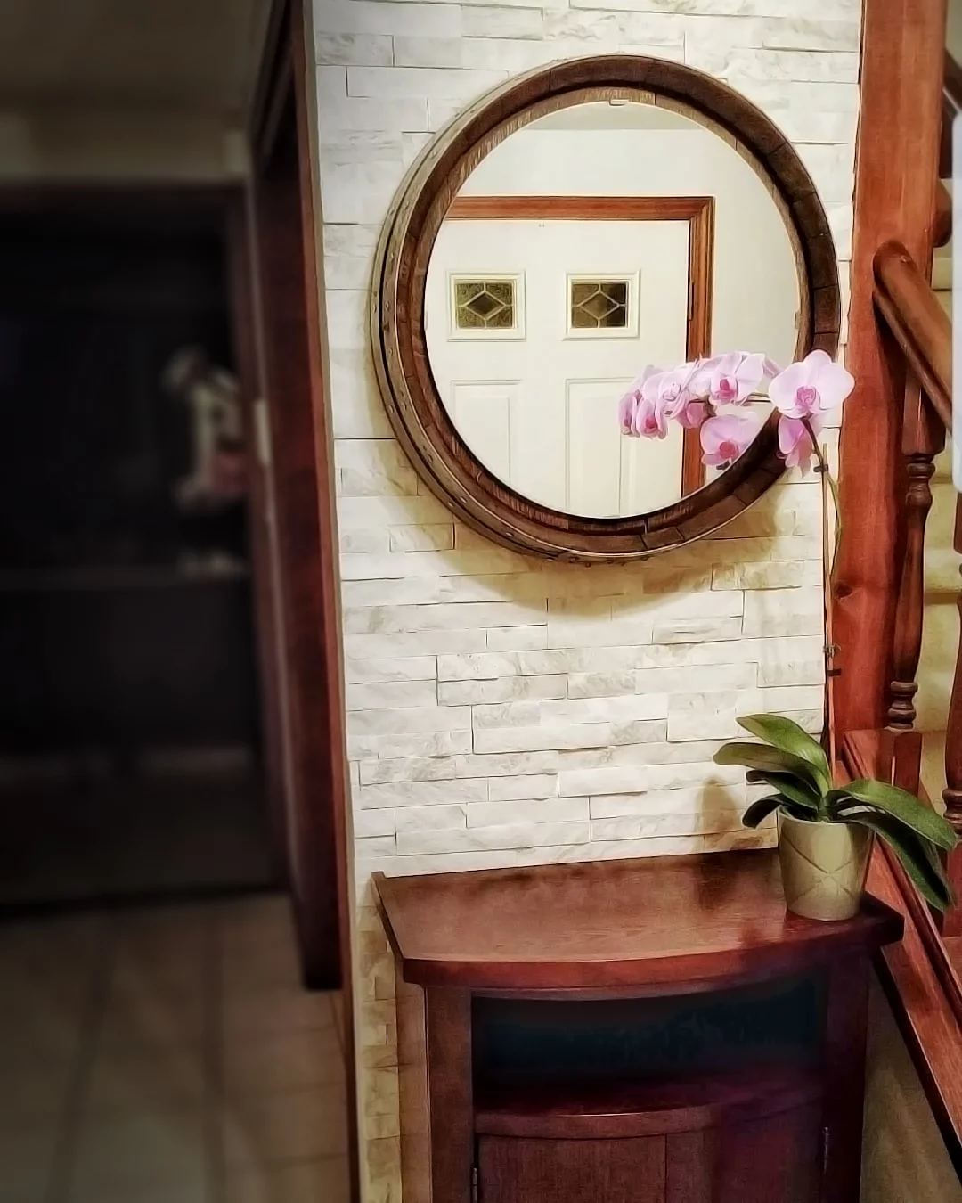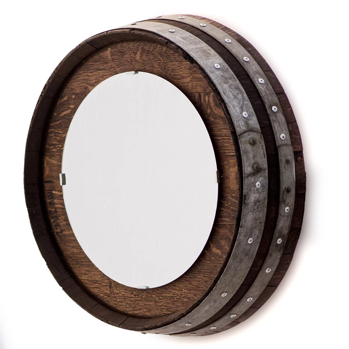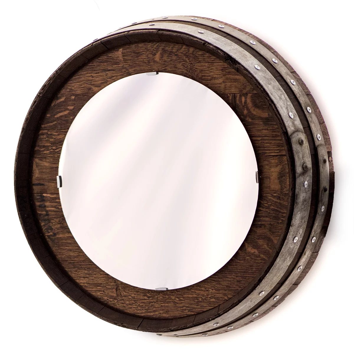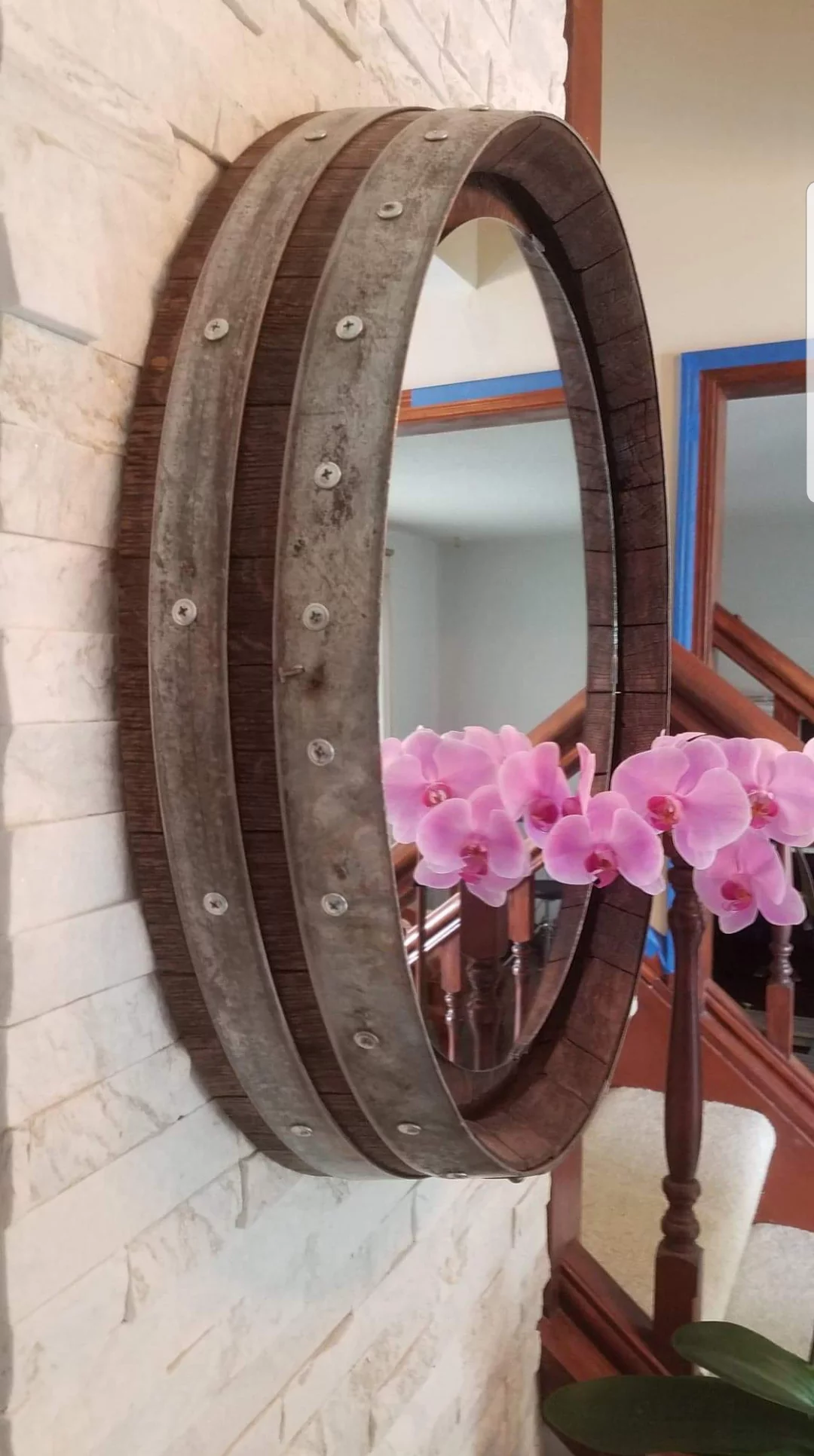 This Barrel End Wall Mirror is a unique and bold wall decor piece that is a definitive conversation starter. Made from retired wine barrels this clock is 24-25″ in diameter and extends 6-7″ from the wall. It mounts using a provided French Cleat so that it remains safely secure to your wall.